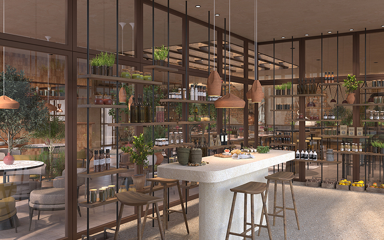 A multi-layered design says alimentari with tobacco faux leather booths, white and black wall tiles, brick, timber and marble finishes, polished concrete or timber flooring with the occasional ceramic tiles and mosaic details. Wooden and metal chairs, leather armchairs, marble and timber table tops, round or rectangular in shapes, a dark painted ceiling, wooden beams, vintage lamps and bespoke detailing, all providing striking visual impressions and a sensory journey to Italy that encourages guests to linger.